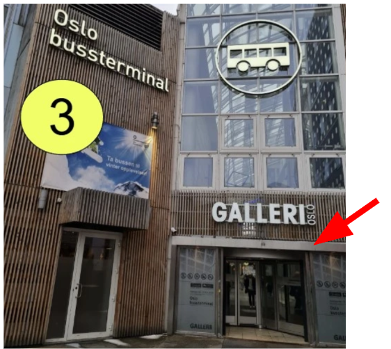 If you arrive at one of the Airports, take the train to Oslo Central Station and follow the signs to Oslo Bus Terminal / Galleri Oslo.